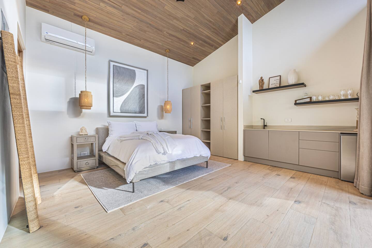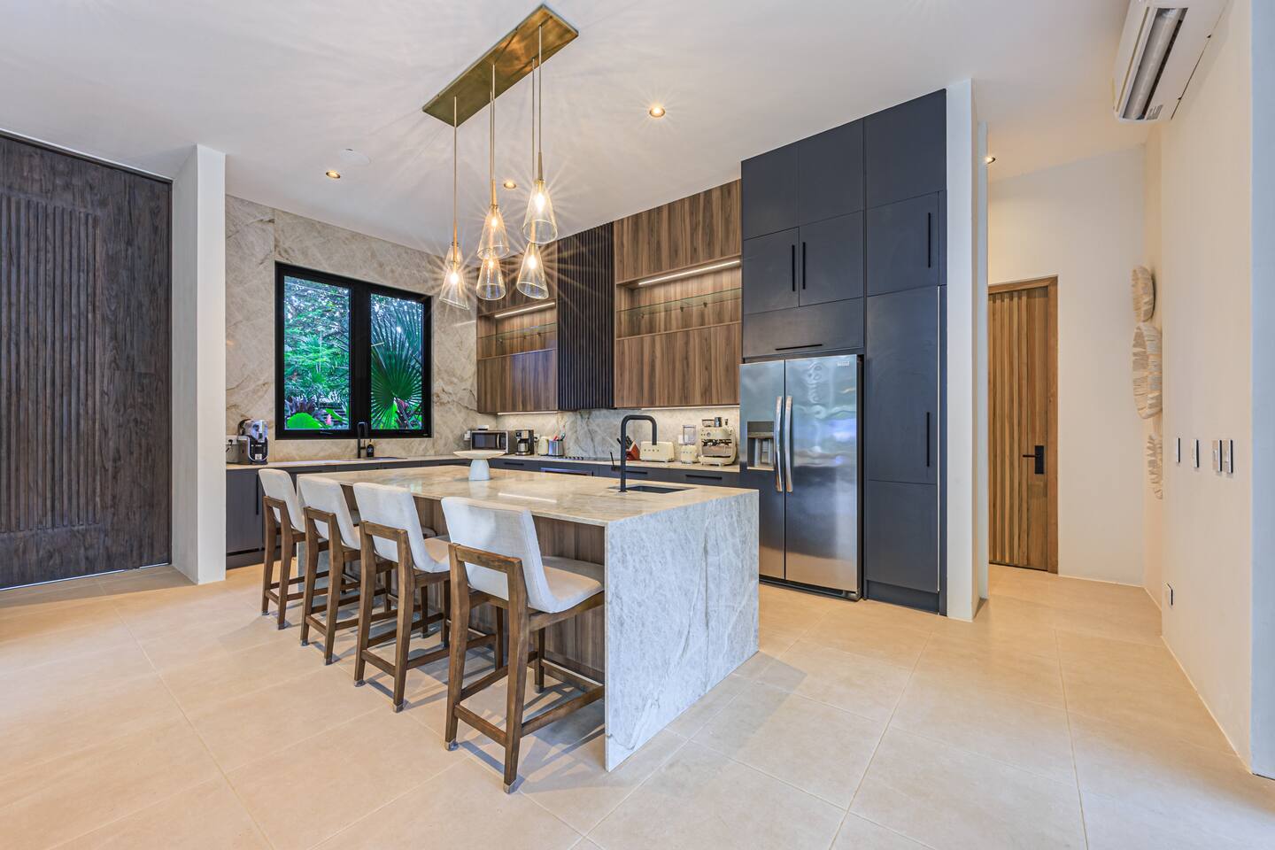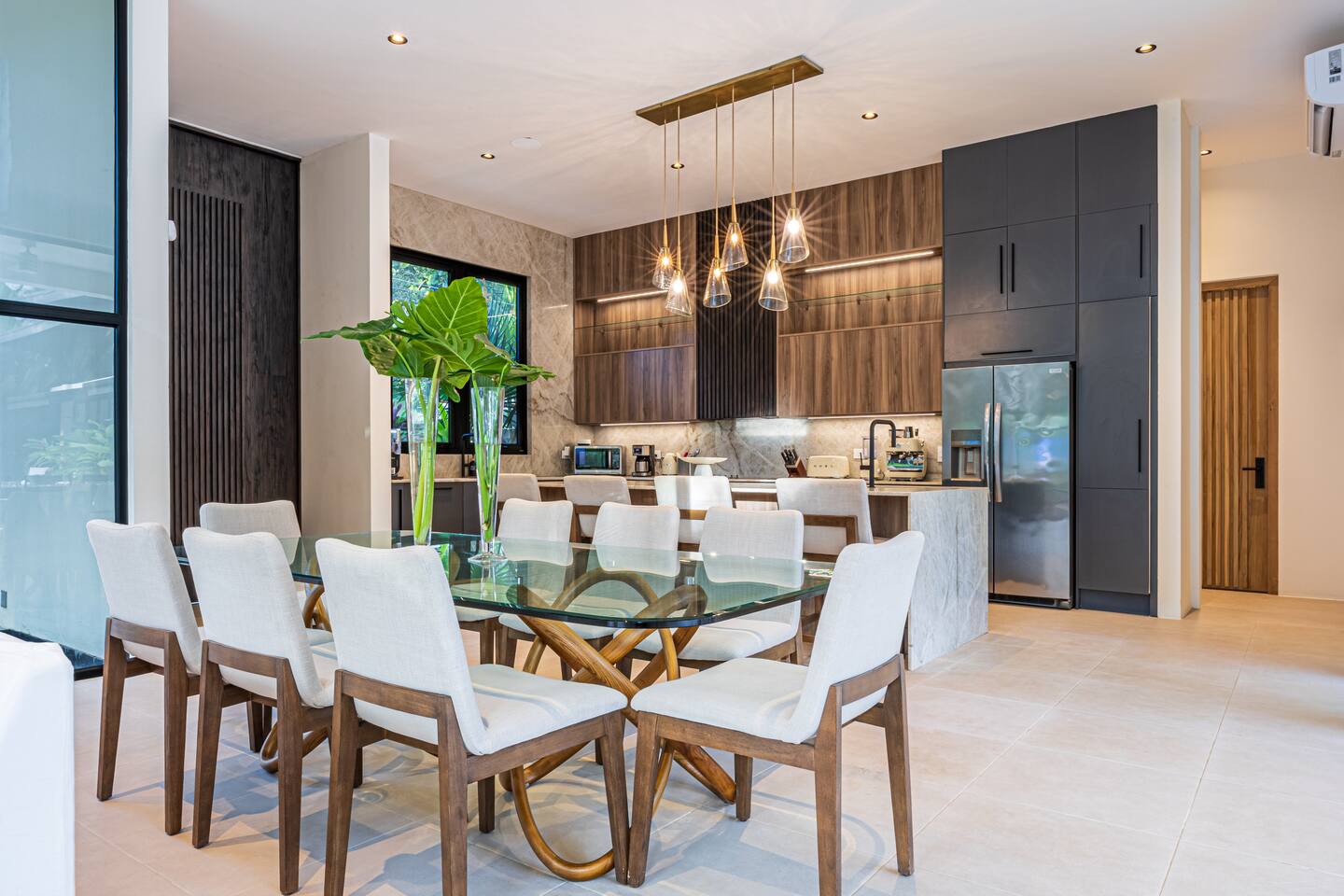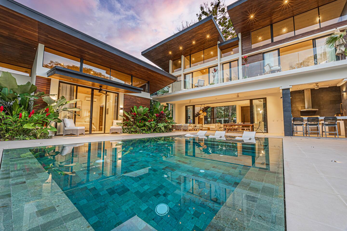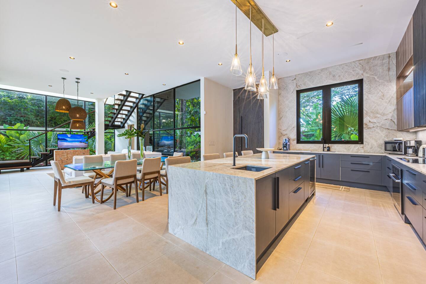 Built in 2024, Casa Etherea is a modern, luxurious villa offering all the comforts of home, set against a lush, beautifully landscaped backdrop in a quiet community. Enjoy both indoor and outdoor kitchens and dining areas, creating a secure, private, and relaxing environment just steps from everything you may need. The four independent casitas each feature a queen bed and a sofa bed—perfect for families. The main house includes two master bedrooms, each with its own balcony overlooking the pool.